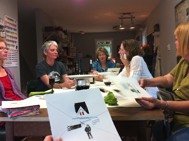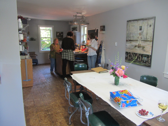 we were at Corrie’s to see the studio, drink a little wine and talk about art and houses and siblings and children and aging, and more art.  This time Laura brought a big stack of the one-a-day collages she made since last we gathered, and much discussion ensued…