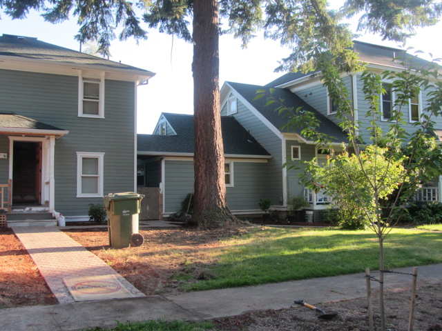 and her husband Curt is just putting the finishing touches on the workshop/garage (ground floor) and Corrie’s new studio space on the top floor…(the local Historic Landmarks Advisory Commission required them to make the windows smaller and offset the porch so the new building wouldn’t look like an old building…I get the concept, but…)