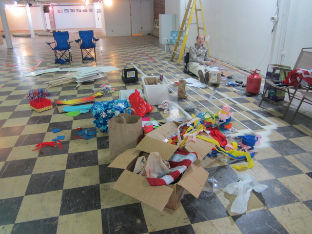 At 7:30 performance artist Michael Reinsch will be doing his one man parade and today he was making the “floats” …can’t wait!