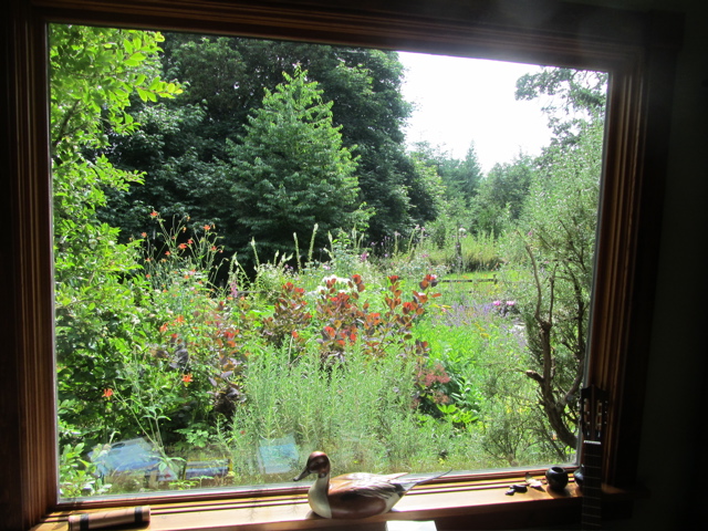 The Carnabys have been gardening here for about 18 years and the creation is all theirs…there was a lawn where the garden now grows with its winding paths… They have 2+ acres but have left most of it wild…creek, pond, woods. Gretchen says the garden is now so good they can hardly stand to leave home, and Marie and I were convinced of that. Birds are a big source of entertainment and interest, with the Carnabys’ preferred mode be to sit quietly and observe…