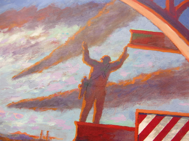 We dropped in to see George and Phyllis yesterday and after a LOT of laughing and a cup of coffee, we went to the studio. Painter George Johanson has been commissioned to paint a painting for the newly renovated Oregon Department of Transportation Building in Salem. The painting is all done and is SMASHING…but under wraps until its dedication in the fall. I just can’t resist showing you a detail though, as well as a photo of George in front of the painting months ago when the color was first put down…no kidding, you’re going to love it!