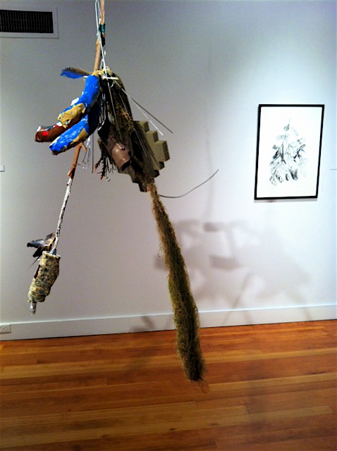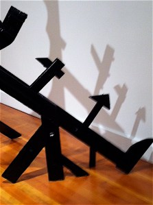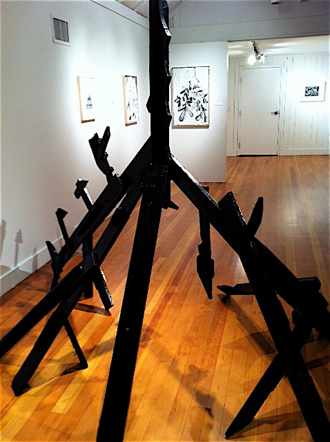 Though a sculptor, Jonathan has been working for a couple of years on a long series of views of a sprig of oregano. One of the best things in the show for me was a black chalk drawing, but all the work has an immediacy that is palpable. The sculpture is particularly wonderful as it adds scale and yet a fragility that is in keeping with the subject…one lone sprig of oregano. The big black piece nicely dominates the show, an amalgam of idea and material at hand (in this case the old shutters off of his house) while the other sculpture…a sort of “junk” oregano…whirls slightly in the breeze of onlookers passing…lively but not a permanent part of the world.