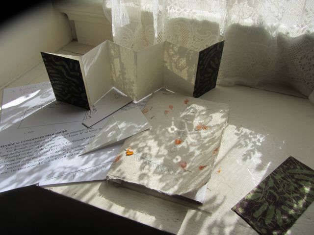 Friday I stayed pretty much in the neighborhood, but luckily this is a neighborhood with fun stuff happening…neighbor and book artist Ann Kresge agreed to do a quick tutorial for me on a couple of basic book formats, before I go off to California for my week at the Lost Coast Culture Machine with Carolyn Schneider.