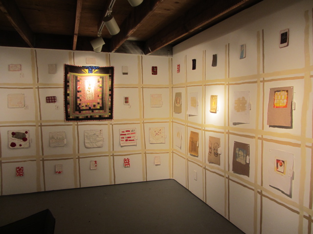 with the final result looking like this and accommodating all of my work on paper and small fabric pieces, plus the Virgin of Guadalupe quilt…and once it was lit it looked pretty great…