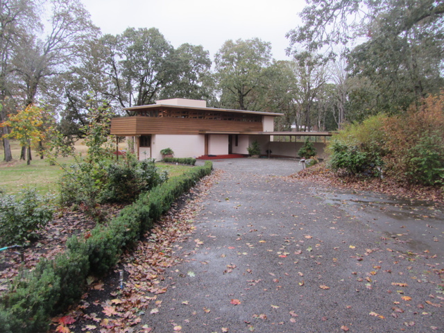 So when I recovered after having my pupils dilated we took off to Silverton to the Gordon House, where R had an appointment to talk about a future show, etc. etc. and I just wandered.  The Gordon House is a small Frank Lloyd Wright house that was built near Wilsonville on the Willamette River in 1964, by Conrad and Evelyn Gordon. The Gordons sold the property in 2000  to persons who wanted to build a new house on the site.  In 2001 The house was donated, “deconstructed” and moved to the Oregon garden, with care given to siting the house correctly in a directional sense.  Now, 10 years later, the house looks like it might have always been in this oak grove…