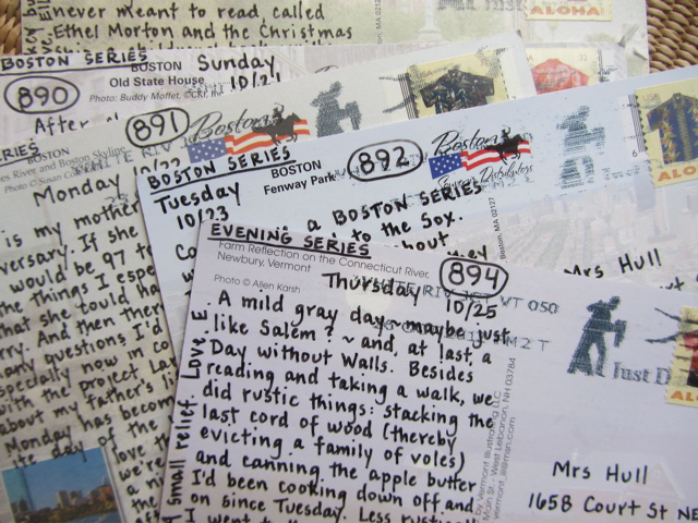 and, of course, the snail blog continues to delight almost every day. My friend Ellen lives in Vermont and is decidedly NOT electronic…and she has been sending post cards (note we are on #894) detailing in a paragraph or two, her life and times in a small Vermont Village…there is a cast of characters, various activities, and both sober and hilarious commentary on her life, as it streams by non-electronically…(this should be a book but I haven’t figured out how to do it…)
