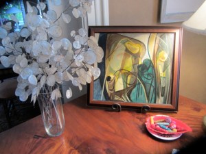 and while I was sitting on the bench doing this, I thought of a drawing I made many years ago when we lived in London for a year. We didn’t know anybody much, social life was limited, everything was unfamiliar except, when I took a walk there was a money plant in the weeds along the path…so I made a drawing of “honesty lunaria”