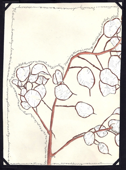 the writing around the drawing says…”…to be able to call the plants by name makes them a hundredfold more sweet and interesting. Naming things is one of the oldest and simplest of human pastimes.” honesty lunaria annua…money plant…etc. I don’t remember where I got the quote but remember that it made me feel happy to find a money plant in the world of honesty lunaria annua. At the bottom of the drawing it says…”on Woodberry Crescent”…and that was where we lived that year, 5 Woodberry Crescent in Muswell Hill…so I had to then go find a picture of #5…