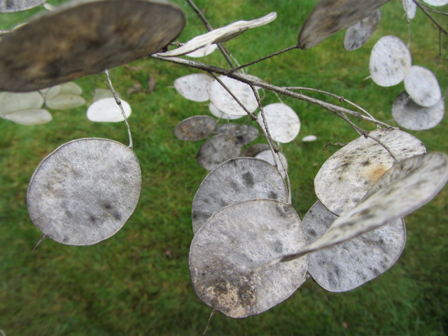 We were outside doing a bit of fall garden clean-up today and I found a stalk of money plant I had yanked out in the summer and put aside to deal …and then forgot all about it. A little bouquet is always nice, so I started removing the seed pod coverings…before you remove the coverings they look like this…