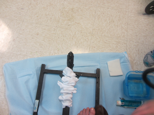 The ankle was pronounced as looking good (and I’ll spare you evidence to the contrary) and Kelly began the new cast.  I chose my color (lime green) and she arranged her materials and a small stand to rest the foot on during the process…