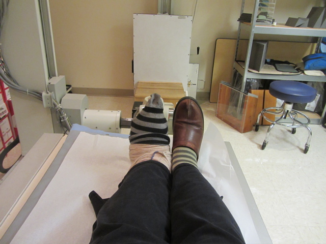 The ankle was pronounced as looking good (and I’ll spare you evidence to the contrary) and Kelly began the new cast. I chose my color (lime green) and she arranged her materials and a small stand to rest the foot on during the process…