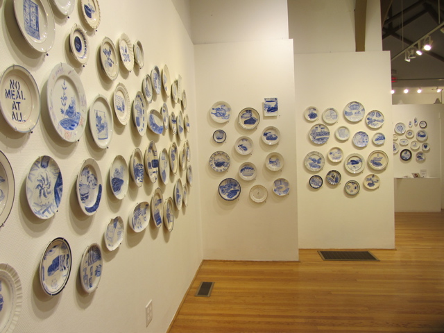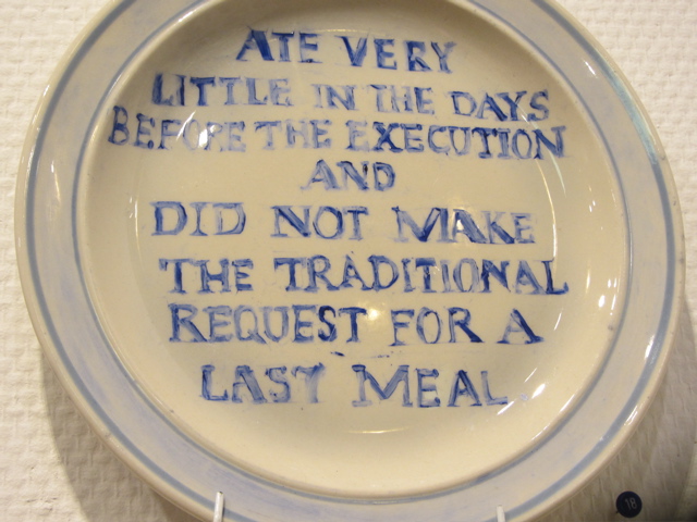 and after a little lunch, arrived at the Corvallis Art Center (700 Madison St.) to see “The Last Supper”…500 plates painted by Julie Green, each plate representing an executed U.S. prisoner’s last meal. Green’s meditation on food, death, humanity, allows the weight of all the plates–all the deaths—to slowly overwhelm the viewer in a way most art exhibits don’t these days…combining thinking and looking. We are there alone in the gallery with each meal, each death, and there is no escaping.