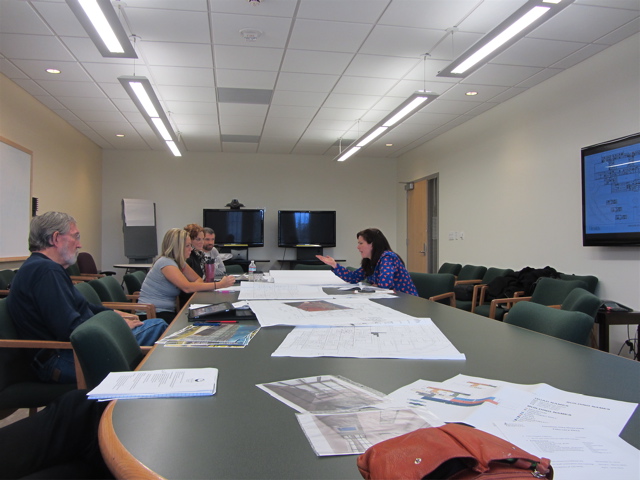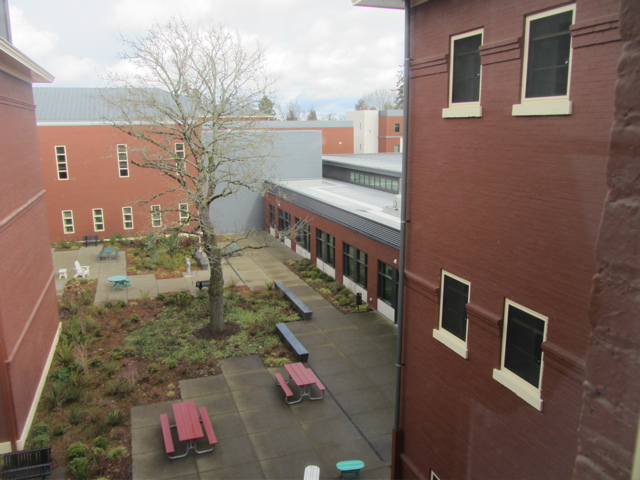 Meagan presented the challenges, discussion ensued, and we were dismissed for the moment.  Nicole showed me the view from the current old facility into the court yard with the new facility beyond…lots to think about…
