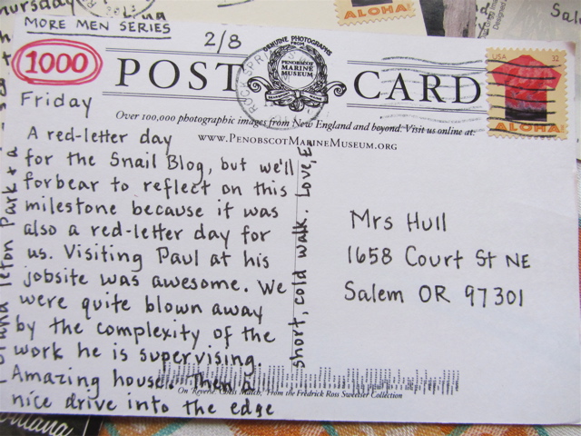 Though we are old friends and have old ties, our current lives are very different. We live in very different parts of the country, I love and use the internet a lot…they have no connection until they go into town for wifi. And so on. By the time 100 cards had been sent Ellen was saying goodbye to the snail blog…