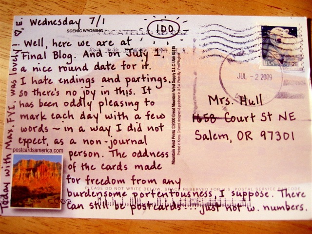 But then…she realized she liked it. She liked hunting for cards, she liked noting down a few thoughts about each day…and she knew, at the other end, I am an “archivist”…and that one day she’d get all the cards back and have a journal of sorts. The snail blog shifted gears. There were “series” of cards …”Evening,” “Domestic Interiors (a personal favorite),” “Men,” “Multiple Images,”…and then cards that are favorites like this one of Gibson’s bakery in Oberlin, Ohio…which Ellen sends over and over as she visits Oberlin on numerous road trips to visit family….