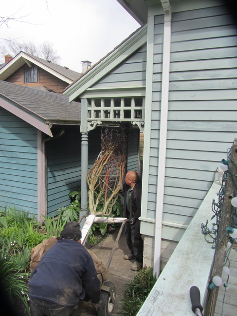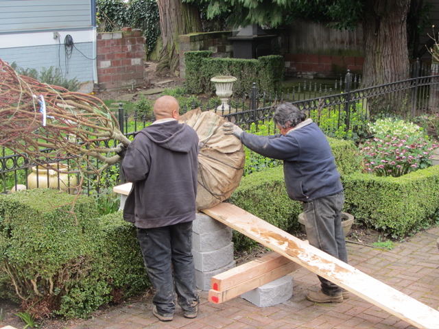 OF COURSE there was a problem…the boxwood hedge… which Felix said would have to go…we said nope.  Take the tree back.  Felix said if he couldn’t get this tree in place it would be the first time EVER, and could I point him to Home Depot.  45 minutes later he arrived back with a VERY clever solution: