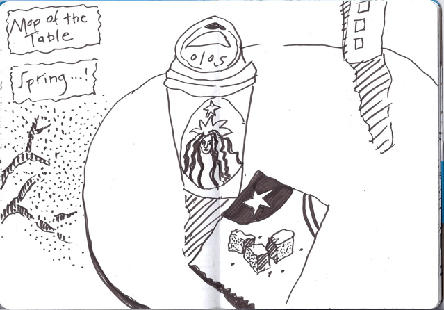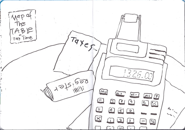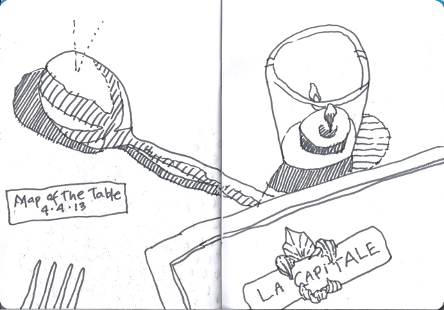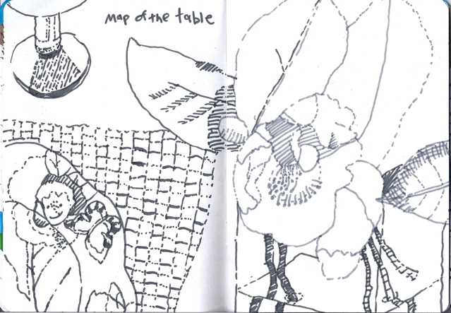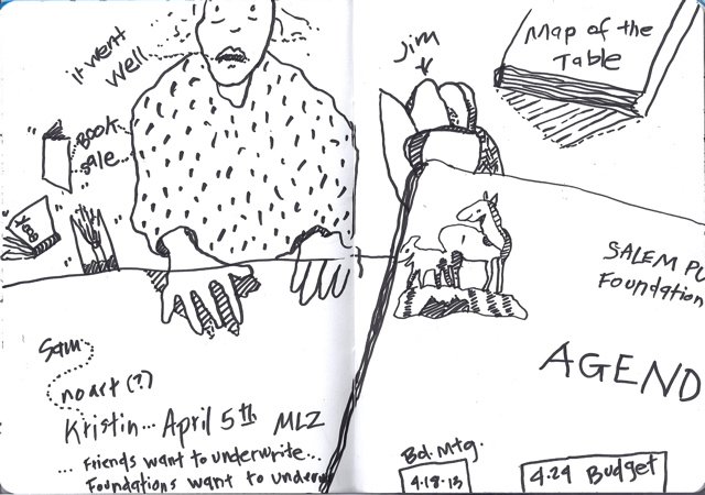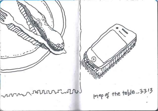 Just finishing up my most recent sketchbook project book in preparation for sending it off to the Brooklyn Art Library…maybe it will come to Portland this summer on the Sketchbook Tour??! One more page to go but thought I’d just put it on here today…it’s called “Map of the Table” and I’ve been dragging it around with me, making small drawings on a variety of small tables around the region…