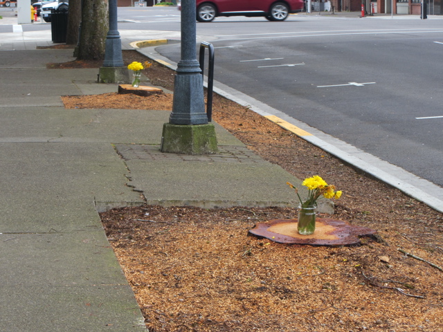 Hmmm. Could it be, perhaps . . . ? Bless whoever left the flowers. Great gesture! And, if those lovely trees died for no just cause (and it appears that may well be the case), but by so doing the community’s sorrow has raised the consciences of the ones who felled them, they may not have not have died in vain. Live, learn, grow abundantly.