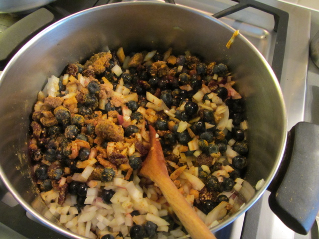 So after visiting the MIG fruit and veg stand Saturday (and getting lunch, of course) I got up this morning with the urge for more blueberry chutney.  I made some at the beach on the fourth and we’ve eaten it all already…yum.  I got the recipe out of the “new” (2012) Oregonian cookbook (“The Oregonian Cookbook: the Best Recipes from Foodday”)…originally the recipe came from Greg Higgins.  At the beach I changed at least four ingredients and made it my own, but here’s the recipe as written, and it’s good!