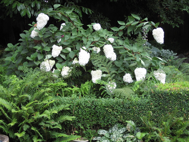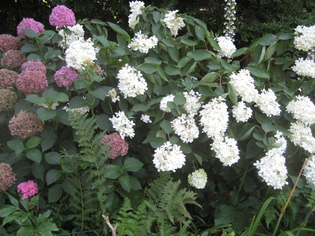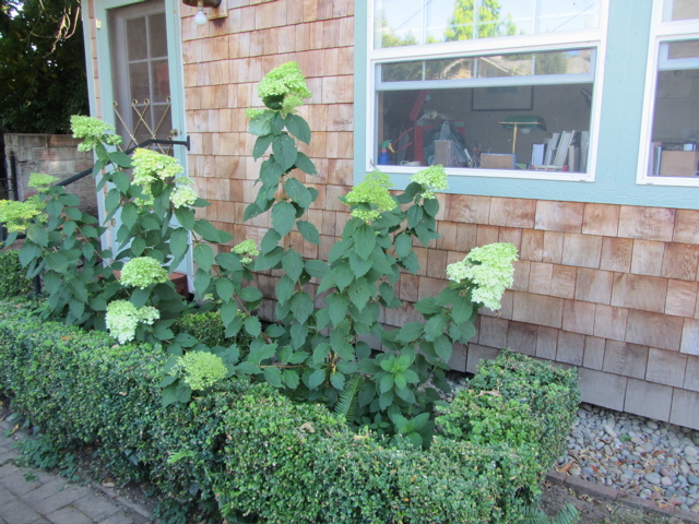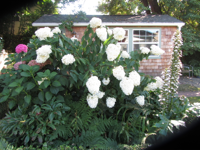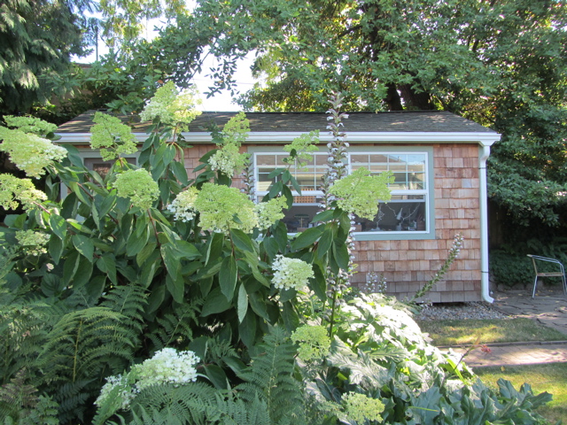 It was a sunny garden, planted by the McElhinney’s about 1930. But now there’s an addition on the house, a deck, and a LOT of shade. In the 90’s Sally got me a peegee hydrangea in exchange for me doing some graphics for Gilbert House, and the peegee has been the queen of the garden ever since…here it is back before we built the studio…