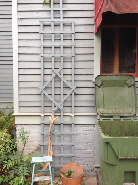 and Bill putting in a new trellis to, number one…support a clematis with a fierce will to live, and, number two to hide the view of the garbage cans from the street. Before we had to cut it down (it was ripping the house apart…ahem) it looked like this…