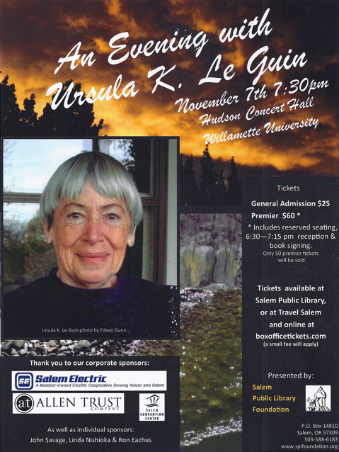 Please consider purchasing tickets to hear Ursula Le Guin, and support this wonderful project at the Salem Public Library!