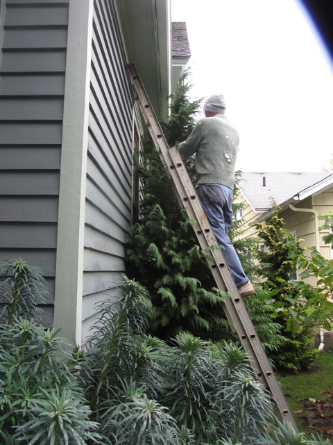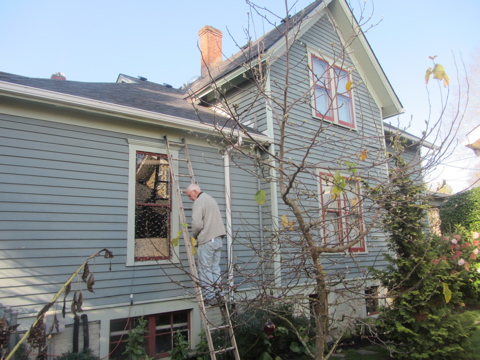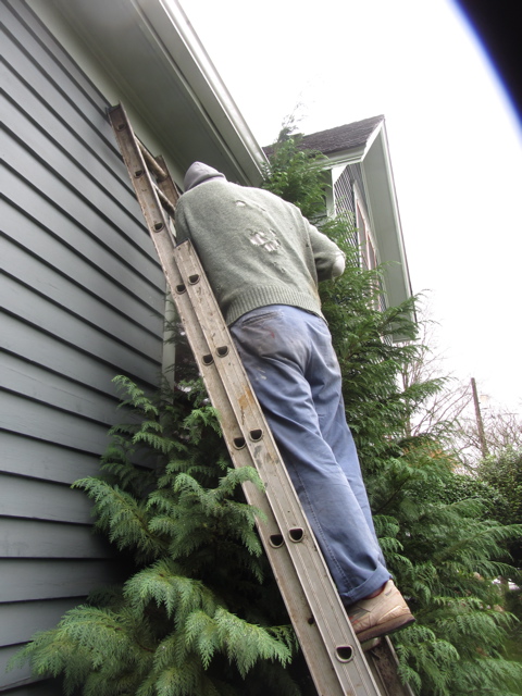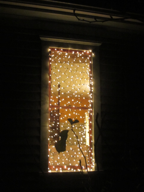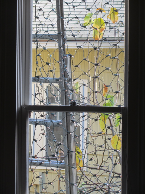 … we knew the trees were too close to the foundation and would have to come out…a summer project.  BUT…we wanted lights this year and hatched a plan to buy a light “net” and secure it within the window frame with cup hooks (nothing must encroach on the historic fenestration of course) …  We weren’t too sure really…thought it might look too grid-like…but up he went…