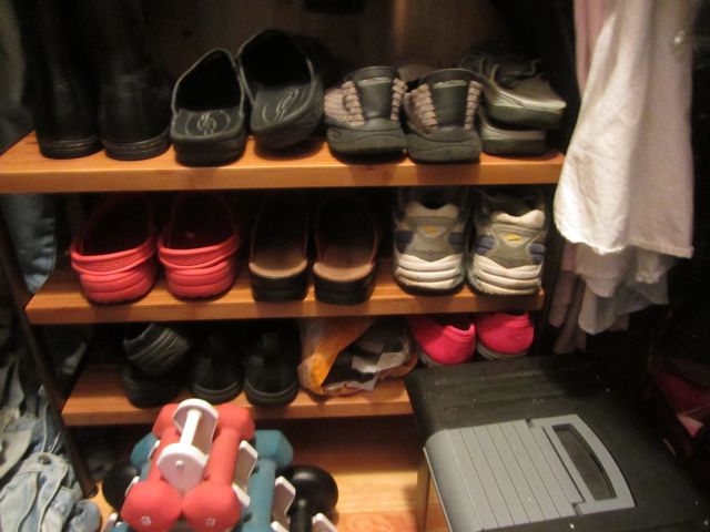 January.  The month of new beginnings, of hopeful restarts, of resolutions…and of cleaning the closet.  Have to.  Every January.  This year I bought a nifty bamboo shelf for the “shoe problem” and assembled it all by myself with no directions (well, VERY sketchy directions, anyway.)  I saw such a thing in a magazine…though MUCH more up-market… as was the closet.  It seems to work pretty well…