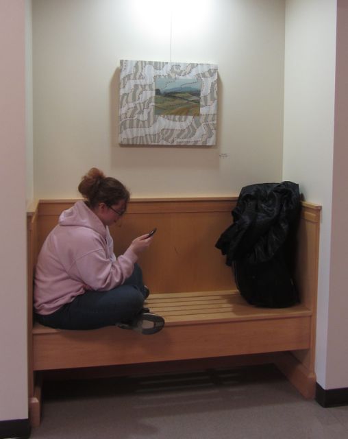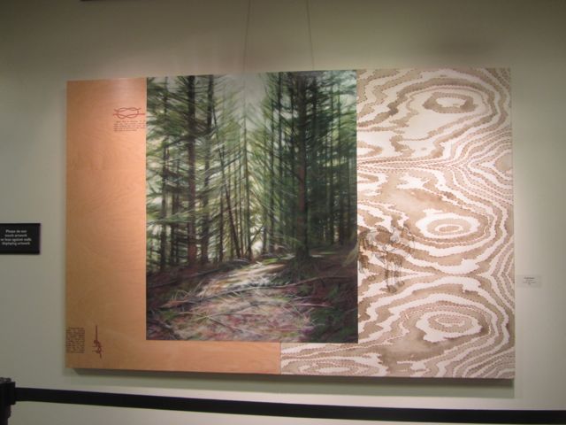 Kristin Kuhns is a prolific painter and woodworker, restless and focused at the same time, producing beautiful and beautifully crafted work. Most of the work in this show was a result of her examination of forest and man, the wildness of nature contrasted with the domesticity humans impose on any landscape…the result of a year of visiting the Xena Forest in Salem almost daily…of recording the patterns…