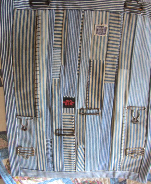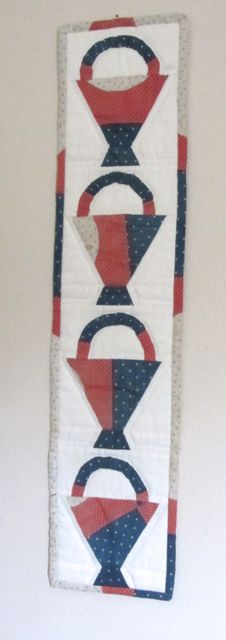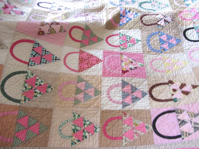 with interesting bits and pieces of old quilts…Ethelwyne’s great grandmother, grandmother and mother were all quilters. Here’s the only section of a quilt of her grandmother’s that she could save…and with the left over bits she made a flower basket hanging…