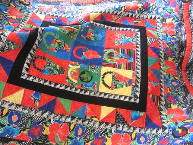 She took a class from Kaafe Fasset and decided to go for “the total experience” so she had him shop with her, then she made a quilt…but there was so much fabric leftover she made a bunch of quilts…