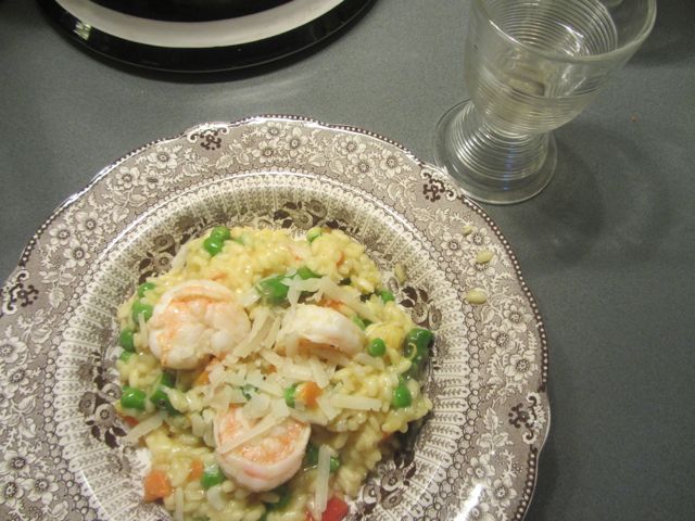 Well, I’m beginning to think Italian thoughts, as we get organized for our trip this spring. The other day I felt the “Spring trajectory” cross the “Italian trajectory” in my head and…presto…RISOTTO! Our totally terrific local fish store FITTS SEAFOOD makes wonderful broth…halibut, chicken, fish stock and shrimp broth. They make the broth there at Fitts Seafood and it has no added sodium…very important to us. So I decided on a shrimp risotto as I had some fresh asparagus, fresh peas, carrots, and the desire to try the shrimp broth.