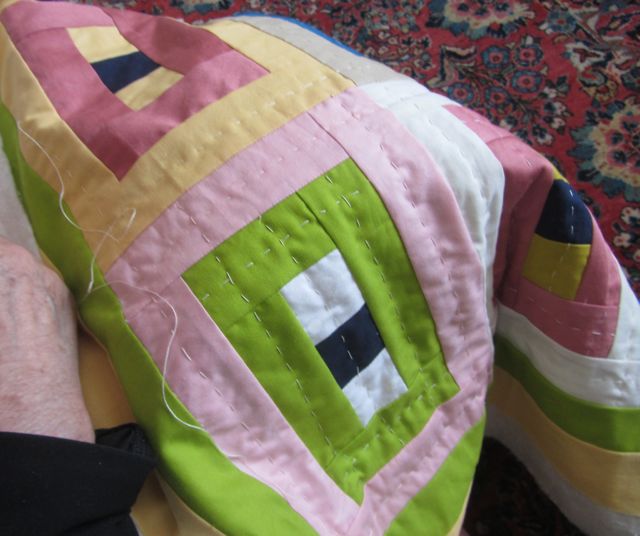 And Kate is finishing up her husband’s retirement quilt for the naps he possibly will take (Bob?…naps?) with a cozy flannel back…