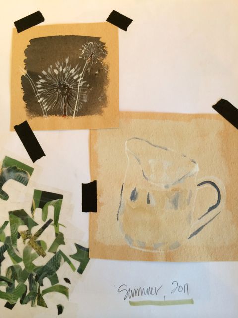 I haven’t been in the studio much…Italy, 4th of July, grandbaby….so today I sort of sunk in for a while.  It’s cool out there in the studio (temperature wise, I mean) totally shaded by a walnut tree and a bay tree intertwined.  As is my habit, I try to find some past work to look at…hmmm.  The bridge paintings?  “The Conflagration in the Garden” from the Adam and EVE series?  Not today.  Today I opened the book of collages I started in 2011…and, as often happens, I liked them much better than I did 3 years ago…especially the ones that are spare…collage book