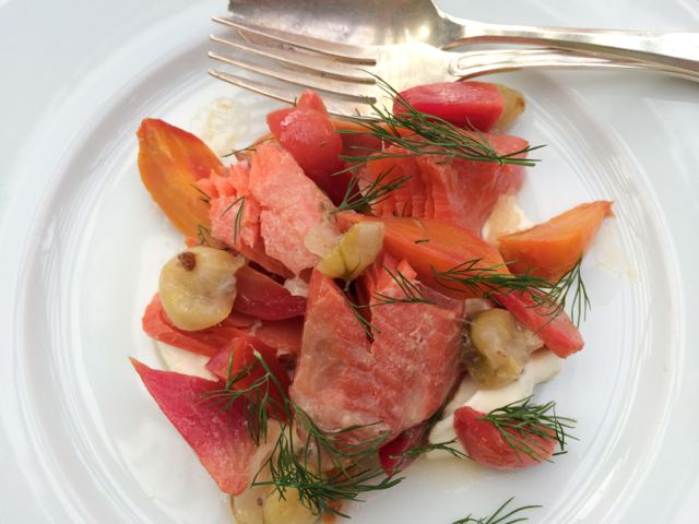 On Friday night the menu is a la carte, 7 starters and two mains.  We chose to share five of the seven starters and then three of us had the cod, two had the lamb.  the starters looked like this…BEAUTIFUL, fresh (they have a farm on Vashon Island) with intense flavors of fantastic combinations…