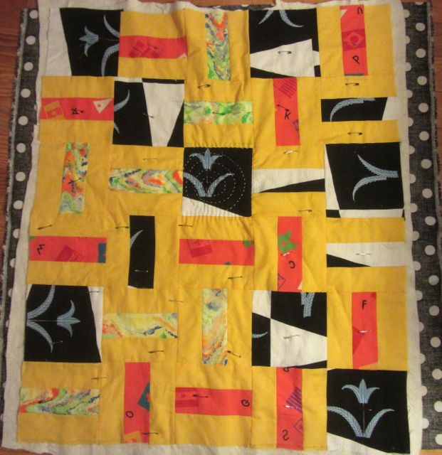 in this case the ugly fabric challenge quilt begins to be quilted (I have until Decemeber…phew)..the orange and the black and white are Japanese Ikata cloth I got in Seattle this summer.  The swirly stuff is what Kathleen gave us in quilt group…just a tiny bit…and challenged us to make a quilt all done by December…ugly