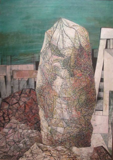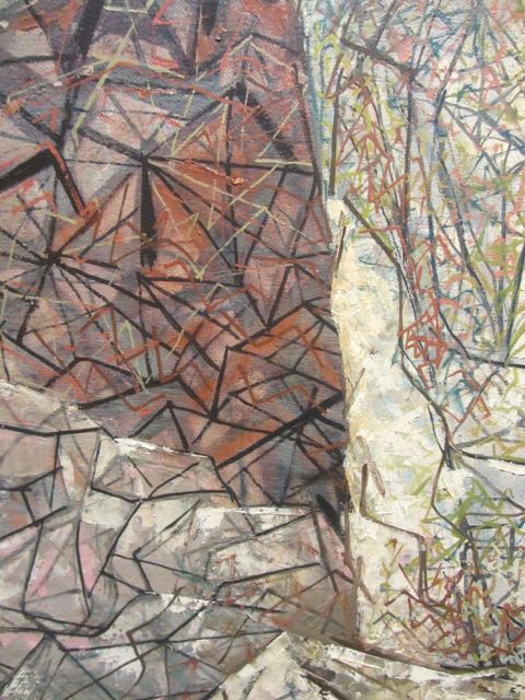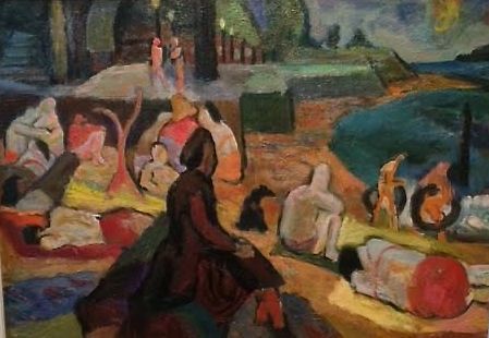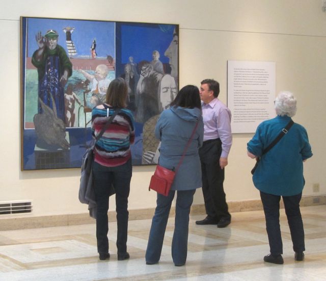 and though various of our correspondents were under-whelmed by the show, we liked it. First highlight a painting George had shown us in the show catalog the night before and the photo just seemed sooo dark…and the painting isn’t…(Geoge on the left in the eyeshade, Louis Bunce in the dark jacket, then Mike Russo, Jack McLarty, Sally Haley, Don Normark, and Phyllis on the right in profile…)