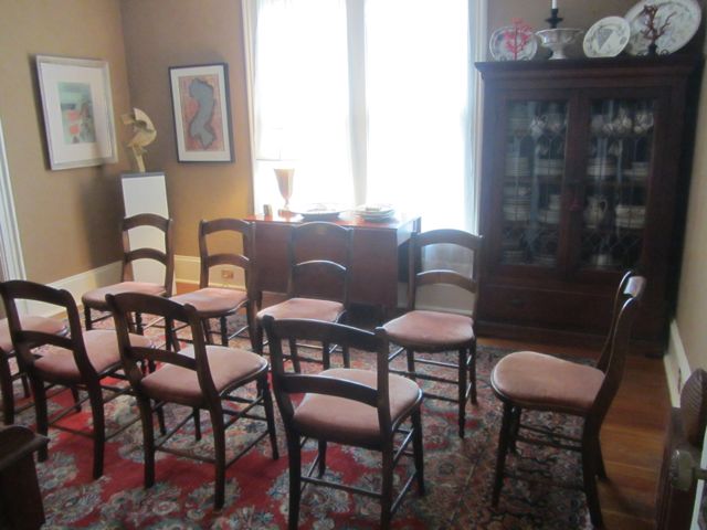 chairs tape 2 I’m cleaning the dining room chairs in advance of the new table that is coming in December.  What seemed a chore yesterday, today became a meditation on old family things, the patina of age, and my mother-in-law.  The chairs have been at our house for 20 years, since Mo died.  As the eldest child, R had been with his parents through all the houses and moves and narrative twists.  He chose something from each era…something that he remembered and cherished…and he remembered when the chairs had cane seats that were failing, and were used in the kitchen at 103 Jefferson Street in Salamanca, N.Y.  Mo had them refinished and upholstered in the 1960’s maybe, in Spokane.  I first saw them at 224 Cedar in Wallace, Idaho in 1969, and thought them beautiful in a plain way…like little deers or ponies, about to trot away.