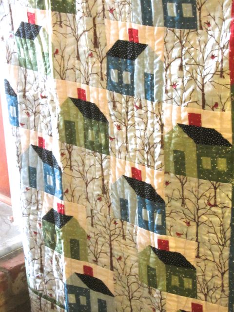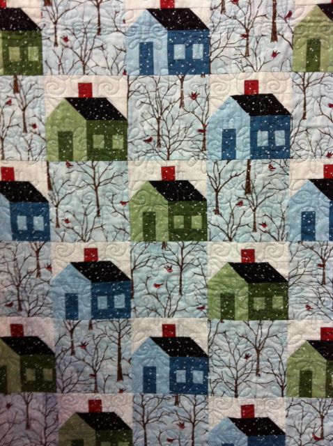 As we were leaving I saw a quilt that looked familiar…I had photographed it at a quilt show a few years ago…before I knew Lynda. I asked her if it was hers and she said no, but she had liked it too so she got the fabric and made a duplicate EXCEPT, the other maker had lined up the house and tree squares evenly, and she didn’t. When I came home I found the other quilt…here on the left and Lynda’s livelier version on the right…