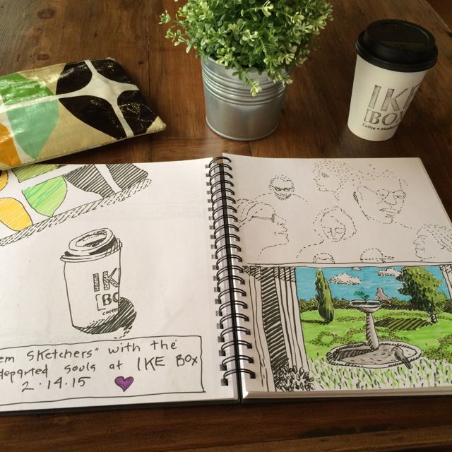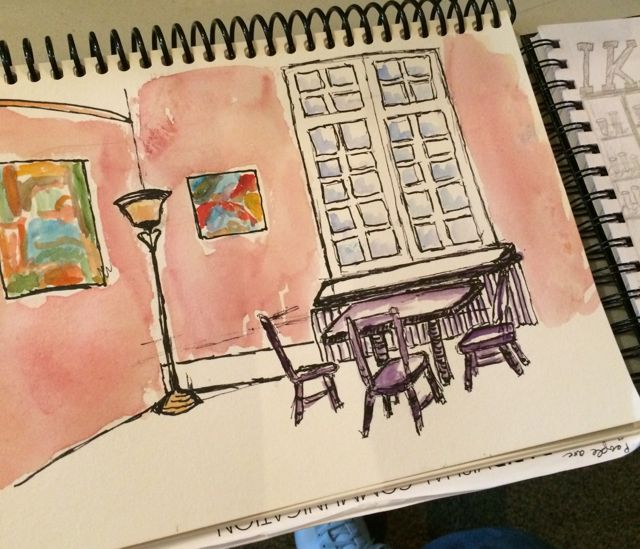 Drawing is one of my favorite activities, and this weekend in Salem there were some fun opportunities, if you like to draw with a group…and sometimes I do. (My brother How turned me on to the Urban Sketchers blog a few years ago…the tag line is “seeing the world one drawing at a time”.) Saturday morning about 25 of the “Salem Sketchers” met at the Ike Box. (Ike Box used to be a funeral home, back in the day. For some years now though it’s been a youth oriented coffee place, and place that offers free spaces for community groups…like us.) The second Saturday of every month the Sketchers meet in a different place, fan out and draw for an hour, and then reconvene and share the drawings. So after brief introductions and grabbing a coffee the group settled in for an hour…