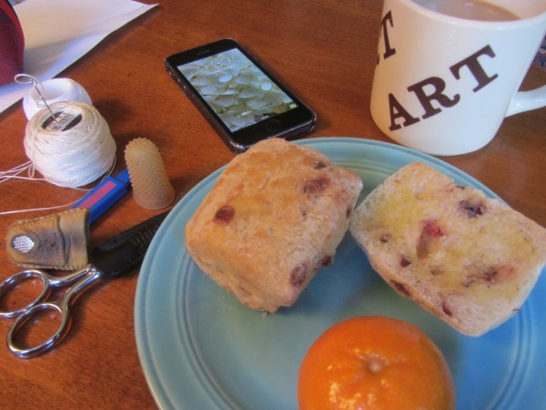 The leitmotif (recurring theme) in my life these days is the sewing, as I get ready for two quilt shows this fall.  I sew in the car, I sew in the morning, the afternoon, the evening, occasionally in bed.  I have a little spot staked out on the couch that catches the bright daylight and is near the fire and a good lamp for evening…with a table at hand for “materials” and a cup of coffee (or a scotch for late at night.)