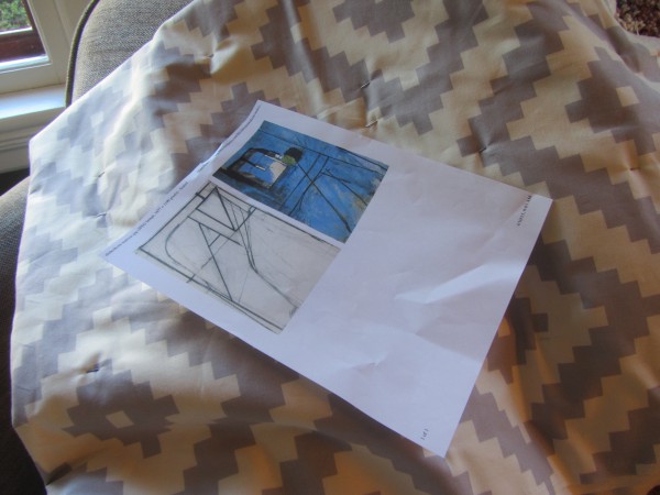 My friend Martha had the inspired idea of suggesting that I make my own upholstery fabric…quilted…with, in this case, some images from a painting of mine that hangs nearby.  I collected it from Jim McDonald this week and am pleased…