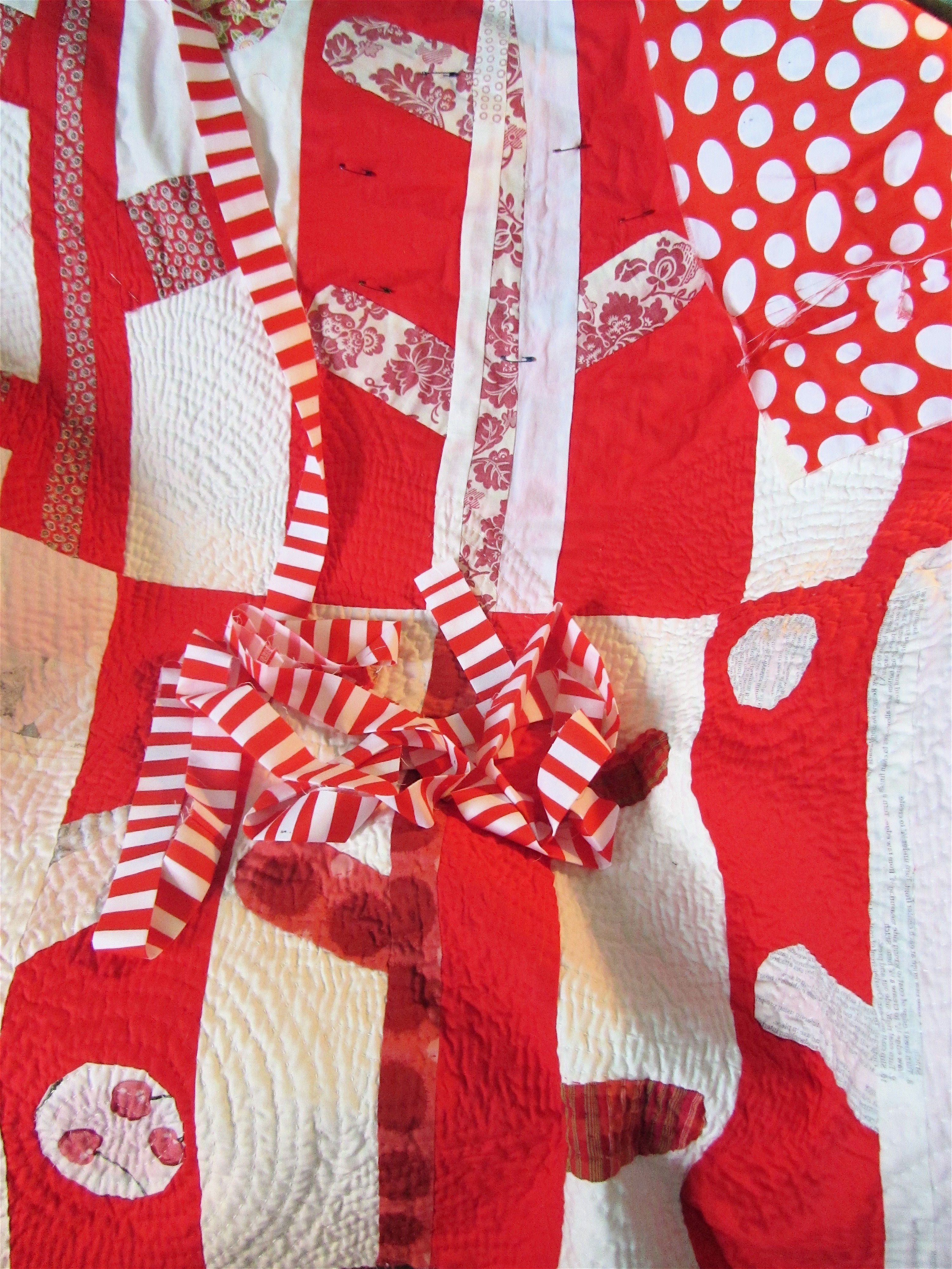 The exhibition curator Hester Coucke specifically requested the red and white quilts so I have included four older quilts, three new quilts made for this show, and one “rescue quilt” (an old vintage top bought at a thrift store and quilted by me.) The concatenations of stitches running through all eight quilts bring together my life for at least the last eight years or so…many are named for places (New Mexico, Italy, Seattle, Shaw Island), places where I worked on them or dreamed them up…all include found fabric, all are hand-quilted. Here’s a peek…