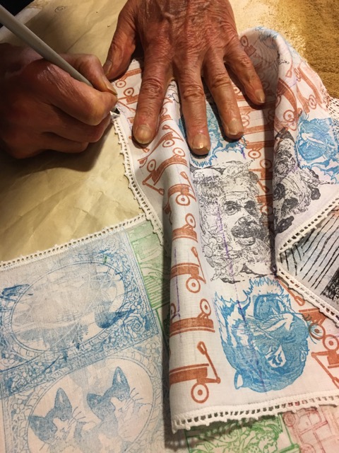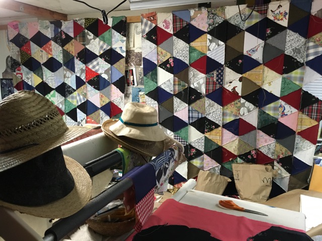 Then out we went to another small house on their property which Lohmann has claimed as his own…inside is a world of fabric and imaginative image making, as well as the examination of materials. Lohmann turned from print-making to quilt forms in 2008, coming out of a family tradition of quilt making. He has carefully worked on not making ANYTHING like something his grandmother would recognize as a quilt…here part of his monumental “tumbling blocks” quilt which will be 21′ high when complete…sewn in 7 foot sections…