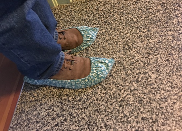 I’ve been a fan of two Oregon artists for a few years, and have written about them both on this blog here, here, and here…only recently discovering they are married. In the wake of the recent blog post on Julie Green’s show at Upfor Gallery, R and I were invited for a studio visit. We arrived in time for a beautiful lunch (which out of politeness I did not photograph…sorry readers, it was GOOD) and to save the newly refinished wood floors R was issued these very elfish (and hence seasonal) booties…