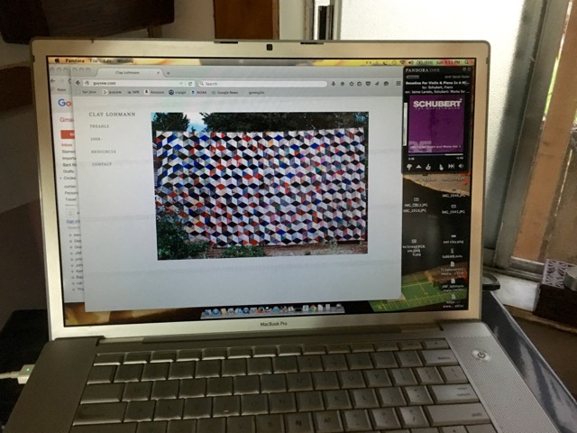 Julie Green teaches painting at Oregon State University in Corvallis, and had to turn to grading the day we visited, so handed us off to her husband Clay Lohmann for a view of his current projects. There are some of his things on view in the house…the painted and stitched “Black Lung” from 2011..