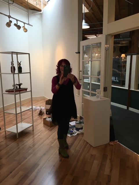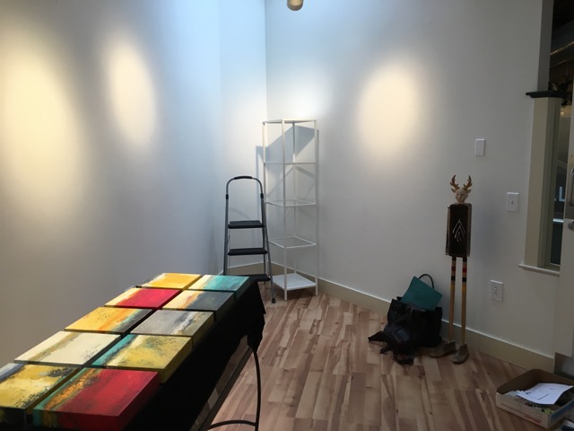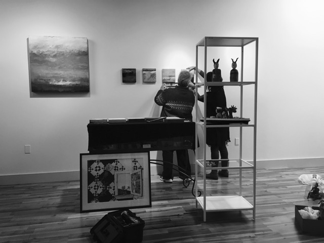 In the fall of 2014 the three of us and 9 other artists were lucky enough to find new studio space in the old Rag Warehouse at Mission Mill. Debbie Leahy and Catherine Alexander were opening a new gallery and had found vacant studio space upstairs. Debbie facilitated the leasing process. Dayna and Tory shared, I shared…and during the year attrition gave us each our own space while, meanwhile, Catherine and Debbie ran two nice galleries downstairs. This fall they moved on to other things and the gallery came open. A group of the studio artists tried to run it, but by December it was proving too much. So…the flying wedge of three…Dayna Tory and me…decided to try it for 9 months. We’ve mapped out the year ahead and hope to have some interesting and fun things happening. Suddenly we are thrust into the world of websites, press releases, show cards…phew! Here’s how it came together this month…