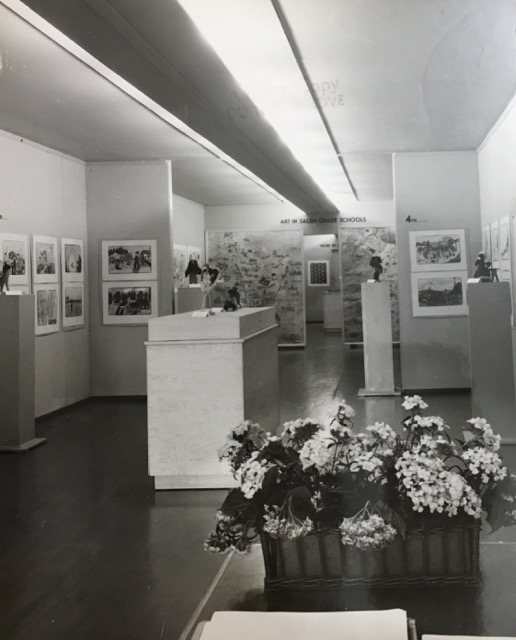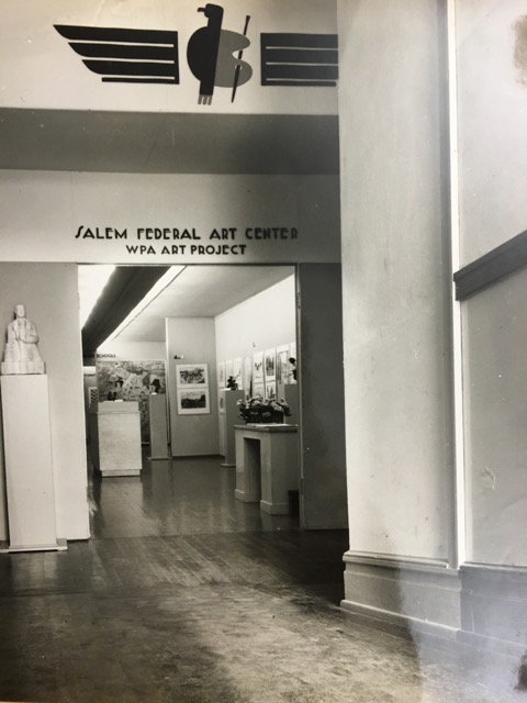 then,we looked at the Salem Federal Art Project. The location of this gallery/classroom/studio complex was in the basement of the old Salem High School on the land now occupied by Macy’s in downtown Salem…