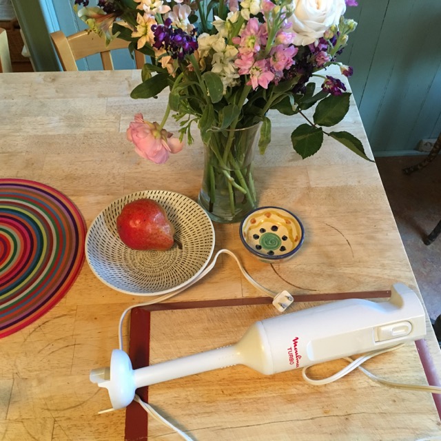 The dressing. We learned at the Arbor Cafe NOT to put the lovely anchovy strips atop the salad as people picked them off and left them on the plate so we sneakily blended them into the dressing so the salad would have the salty delicious anchovy taste but would not confront the customers with the (apparently) horrifying hairy fishes. In the NYTimes version all the ingredients are put in a blender or blended with a hand blender (my choice) and the poached egg (poached in the microwave) was added last. Short aside…my Moulinix turbo is an indispensable tool in this kitchen…