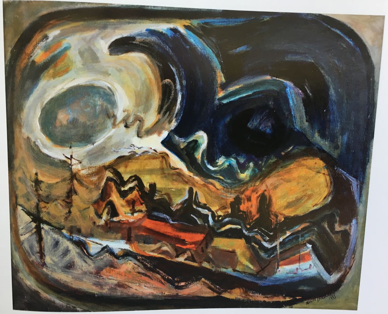 R has undertaken a re-evaluation of Nelson’s vast body of work which extended over the course of 65 years (he died at age 88 in 2006, born in 1917).  Much of the work is beautiful and worth taking another look at…like this gorgeous painting of 1953, “Road of the Brave”, which is in the lobby…